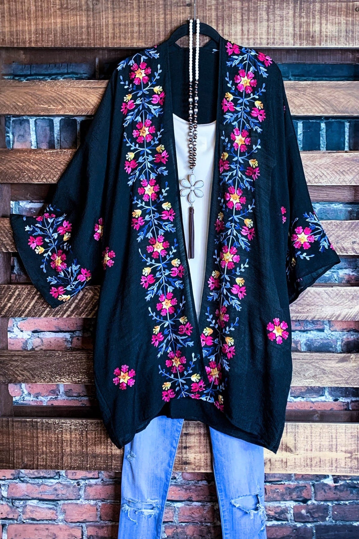 IT'S LOVE AT FIRST SIGHT BLACK EMBROIDERED KIMONO