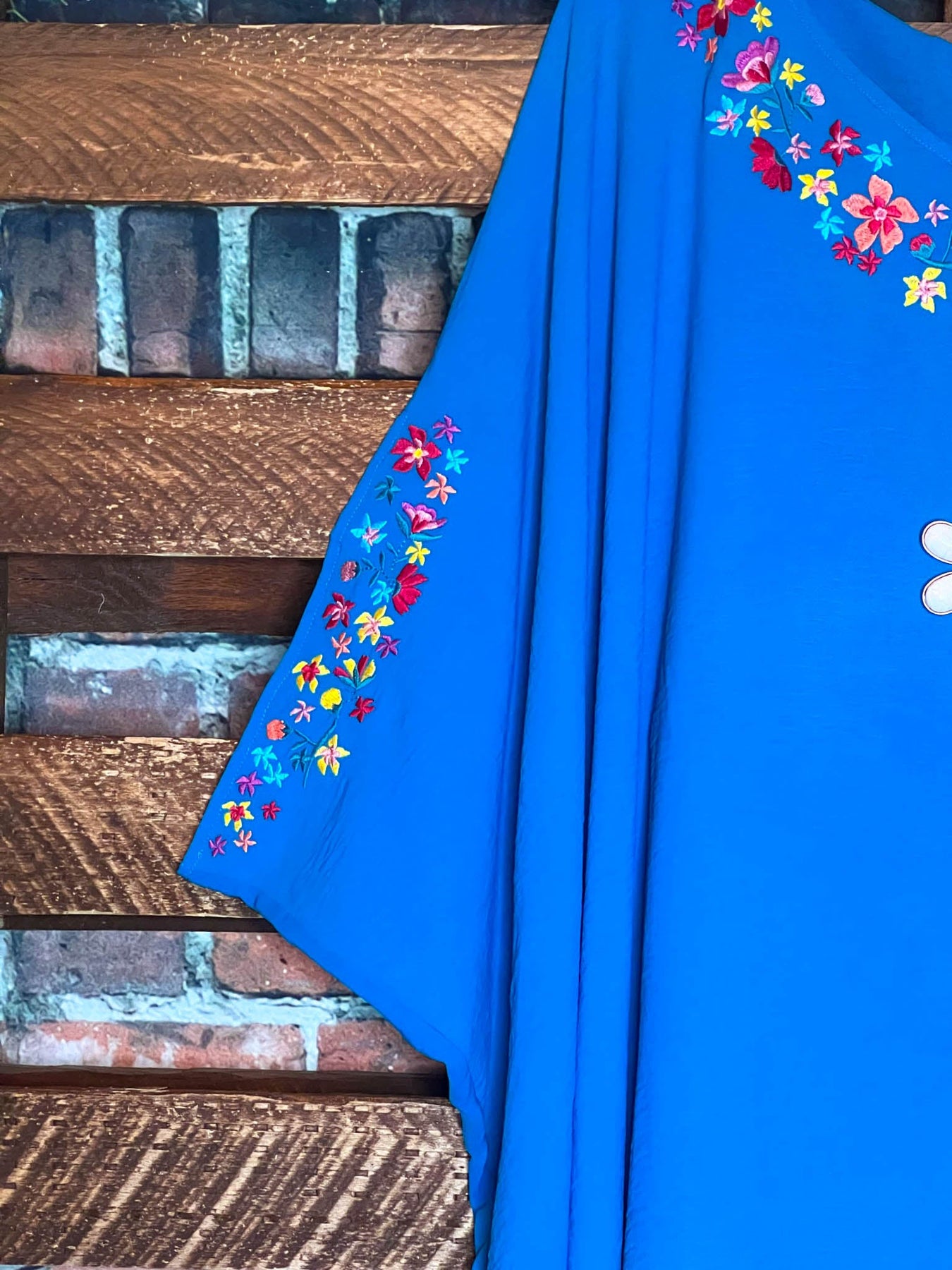 PRETTY PERFECTION EMBROIDERED OVERSIZED TUNIC PONCHO IN ATLANTIC BLUE