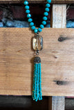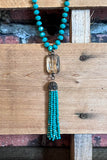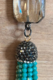 - Long crystal bead strand necklace holding a crystal and beaded tassel