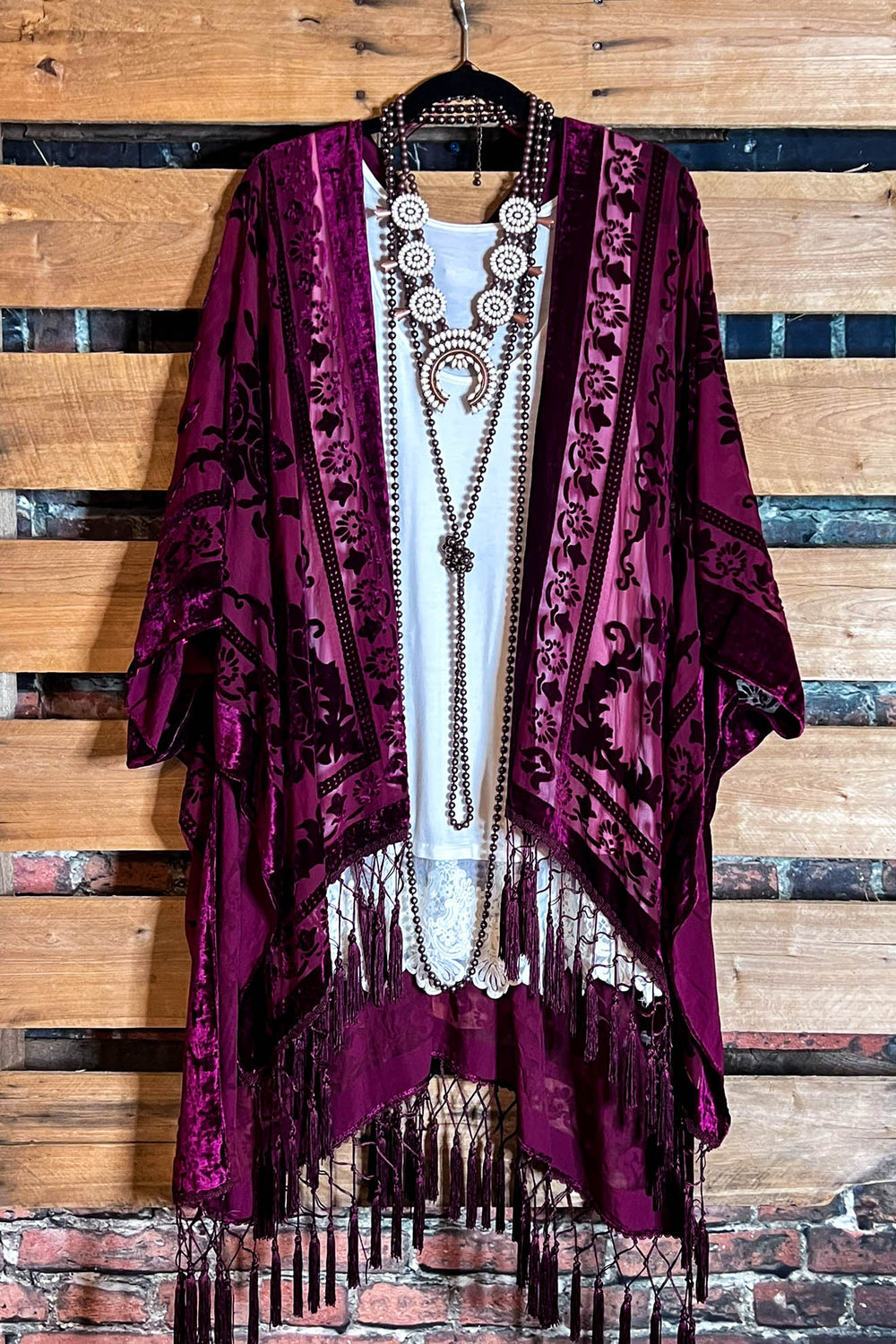 LA VIE BOHEME VELVET BURNOUT KIMONO BURGUNDY