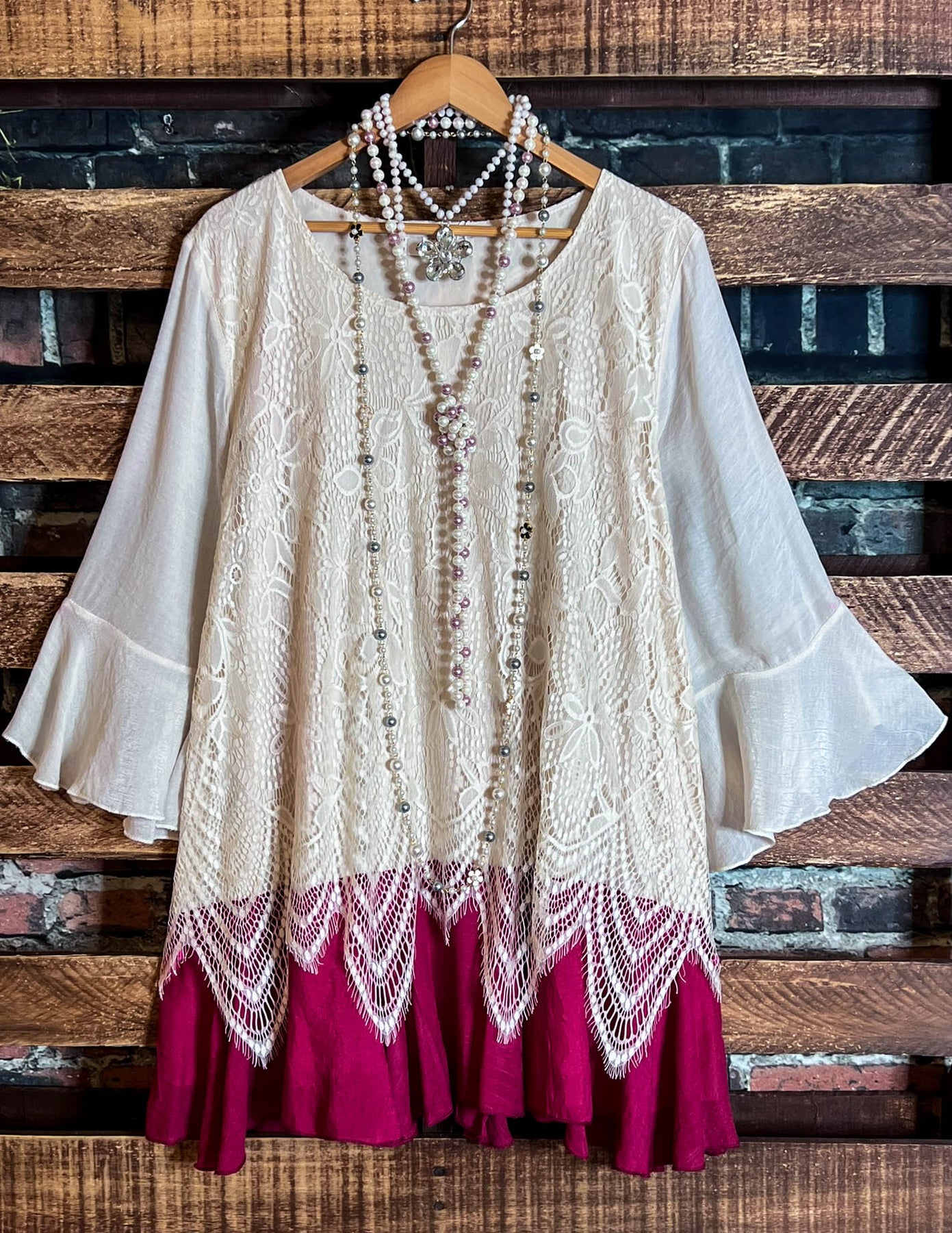 ABSOLUTELY UNFORGETTABLE FAB LACE TUNIC IN BEIGE & CRIMSON