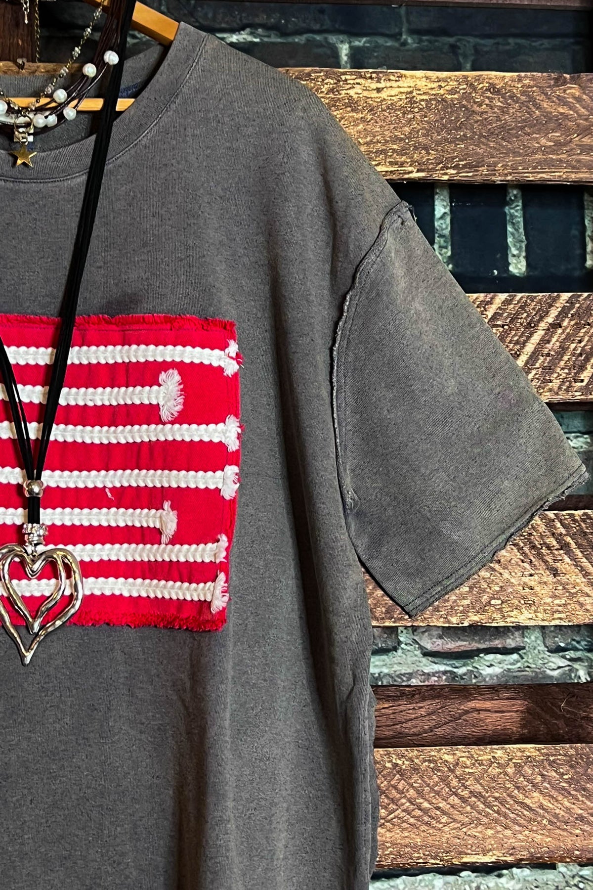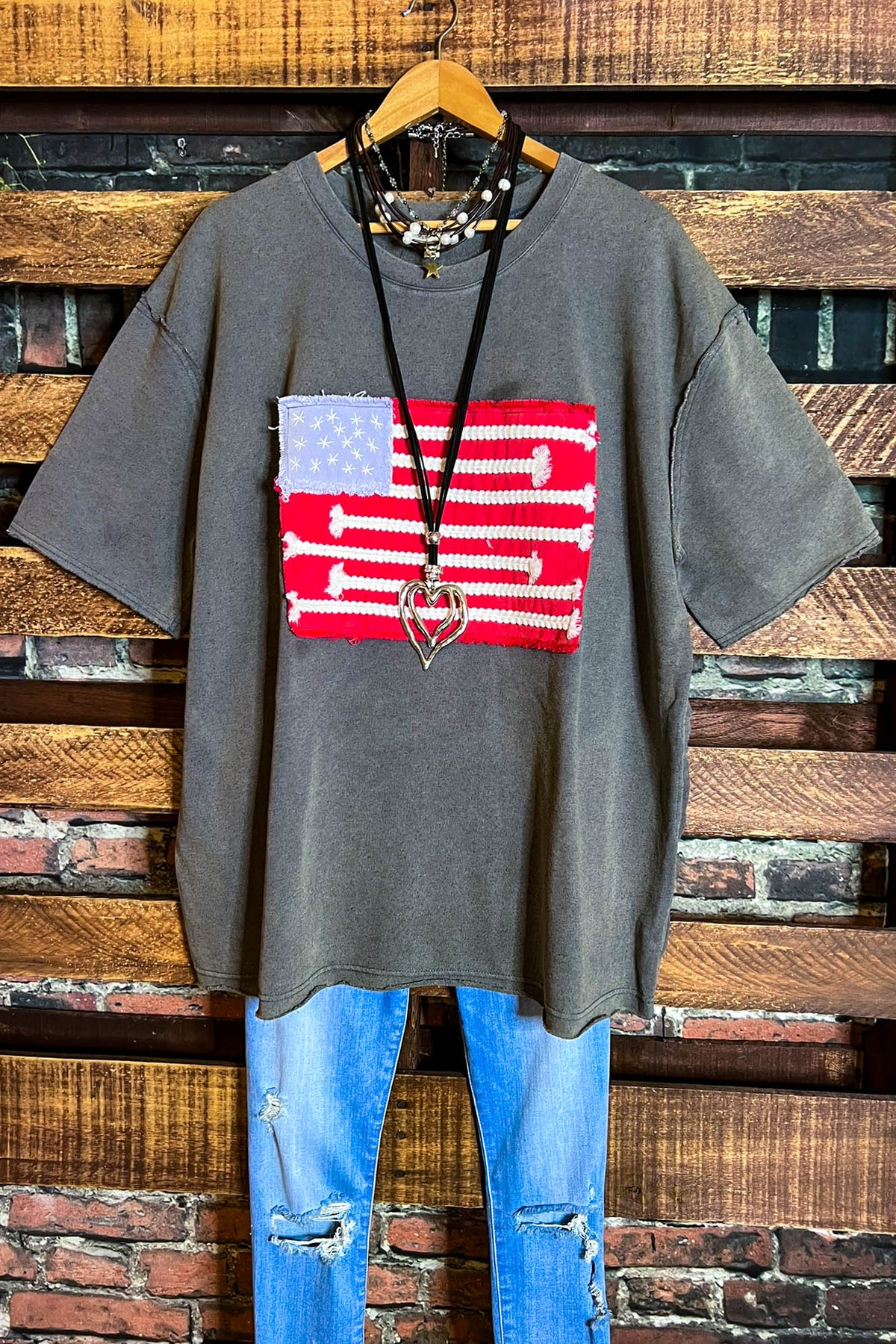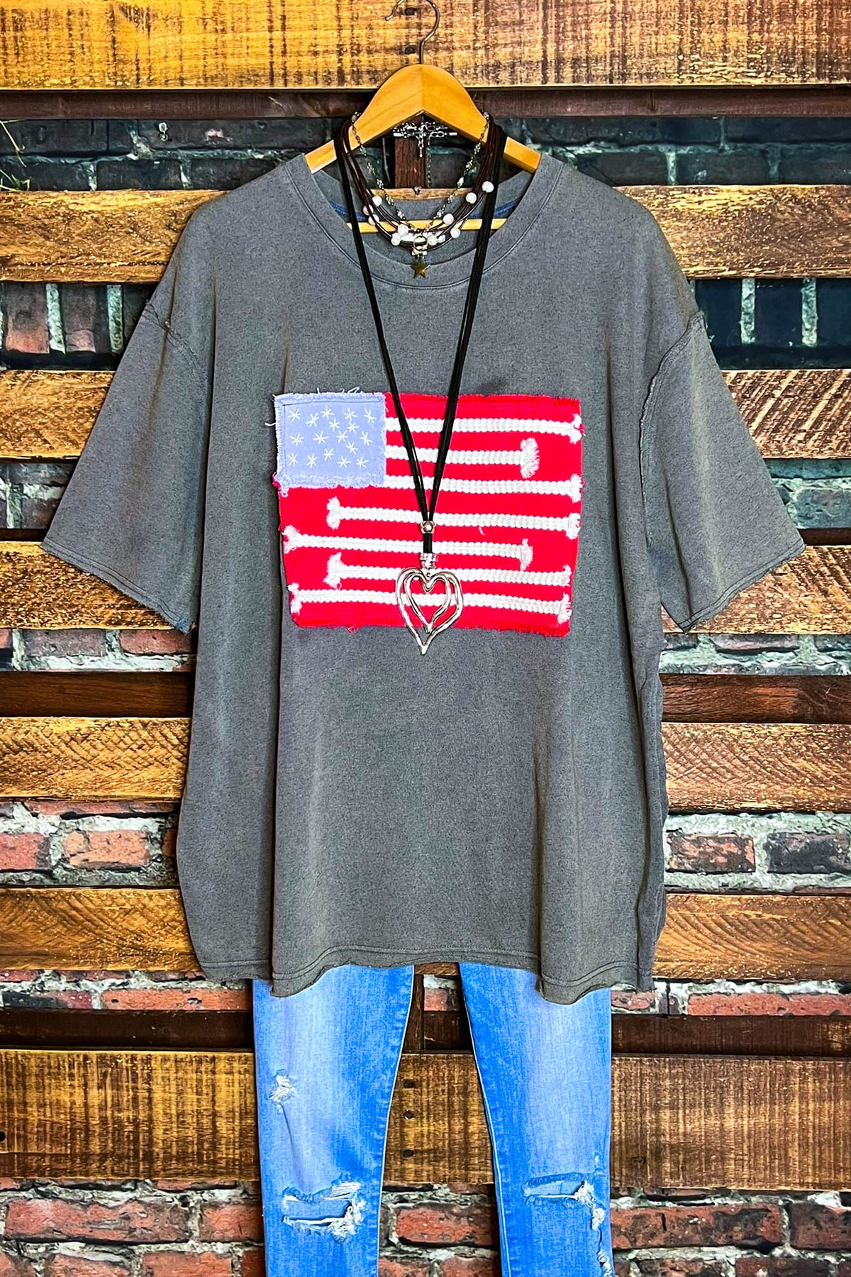 FEEL FREE 100%COTTON MINERAL WASH AMERICAN FLAG PATCH TUNIC IN GRAY