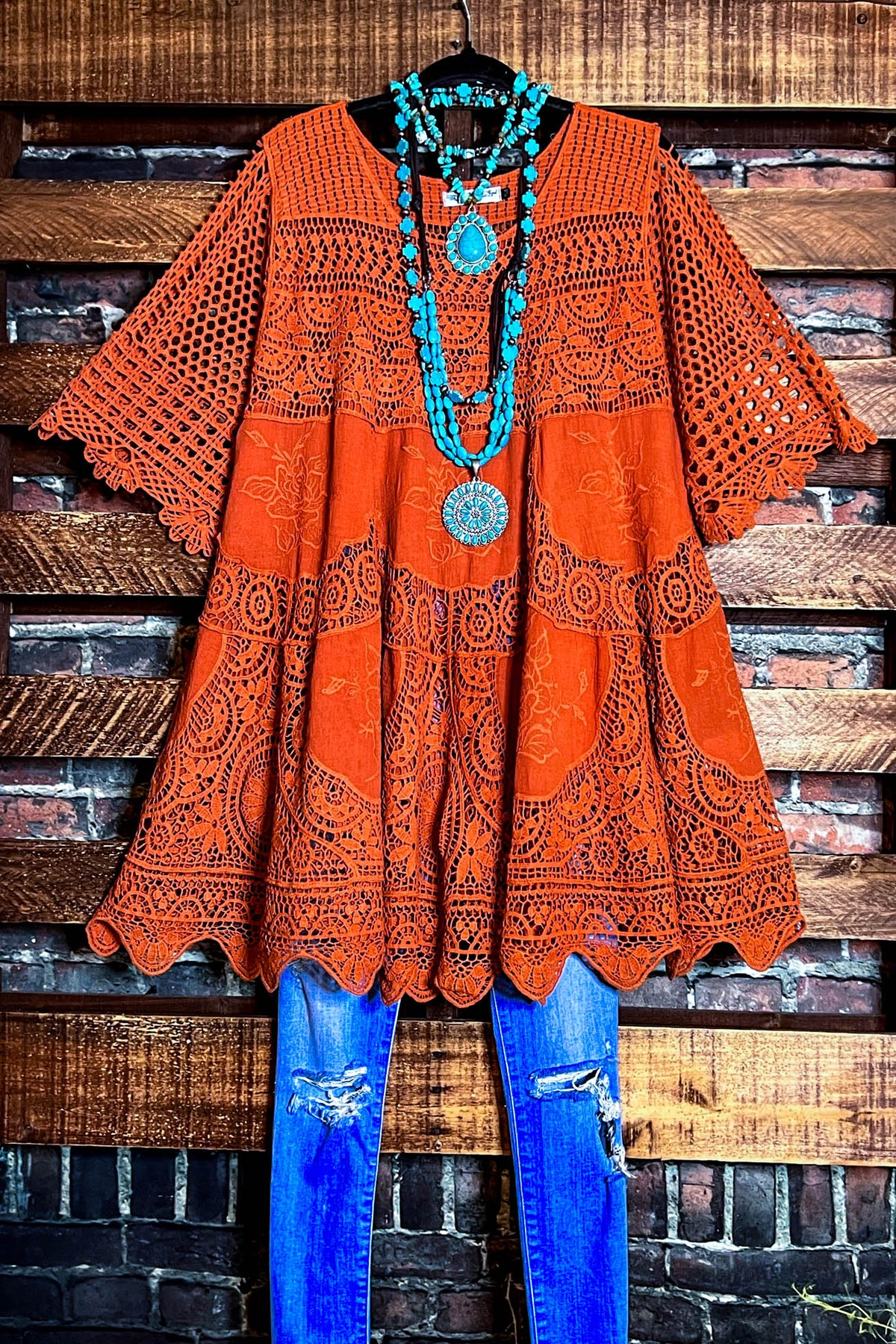 GRACEFUL BEAUTY 100% COTTON CROCHET LACE TUNIC IN RUST