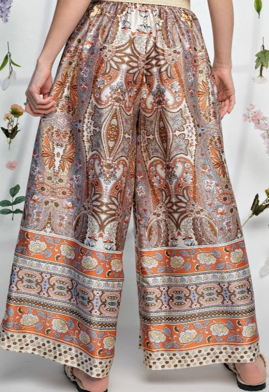 SEA BREEZE SATIN PRINTED WIDE LEGS PLUS SIZE PANTS IN CORAL & MULTI-----SALE