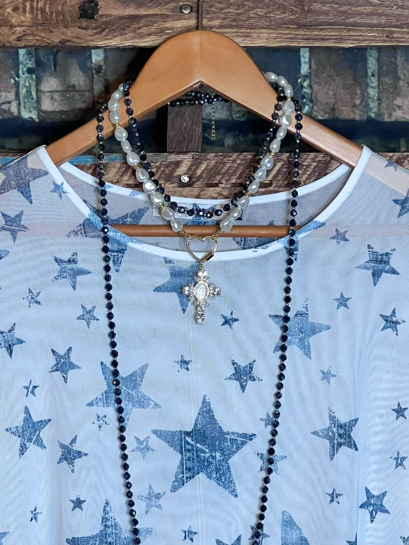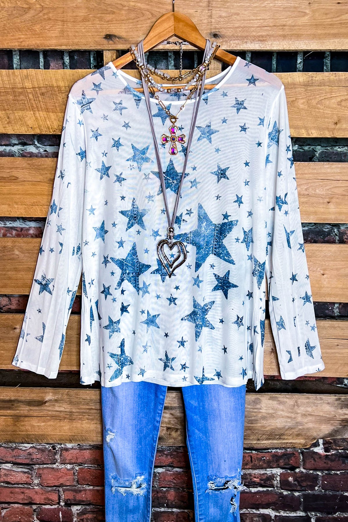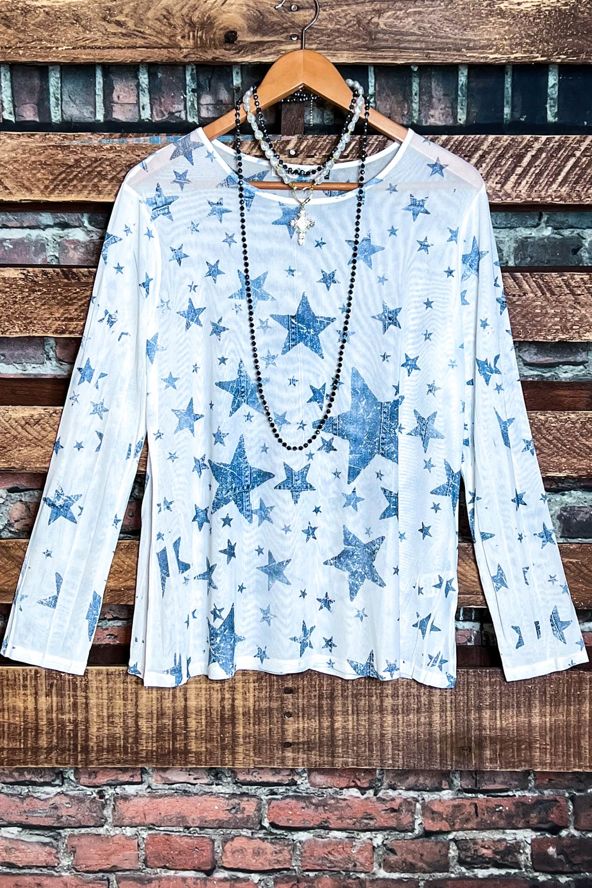 SPIRIT OF BLISS STARS BLUE DENIM MESH TOP