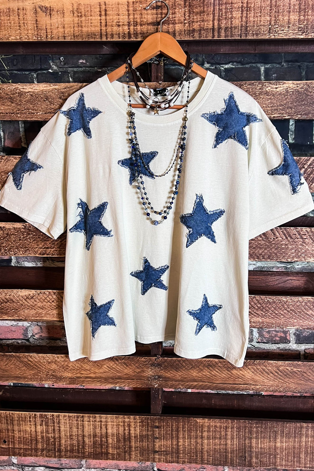 MOMENTS OF JOY STARS DENIM PATCH T-SHIRT TOP IN BEIGE & DENIM