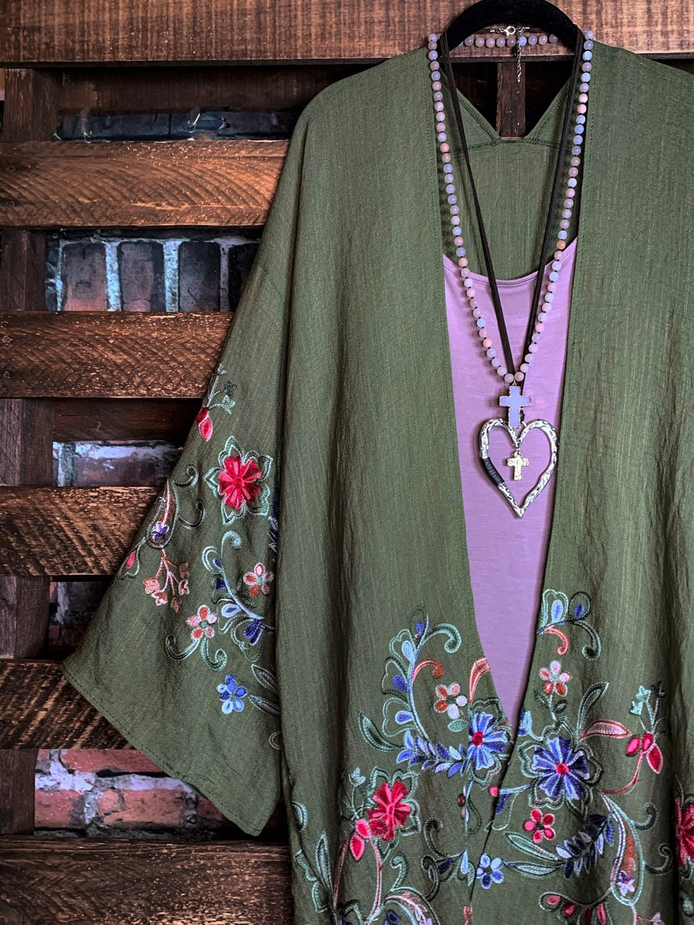 GO WITH GRACE OLIVE FLORAL EMBROIDERED KIMONO