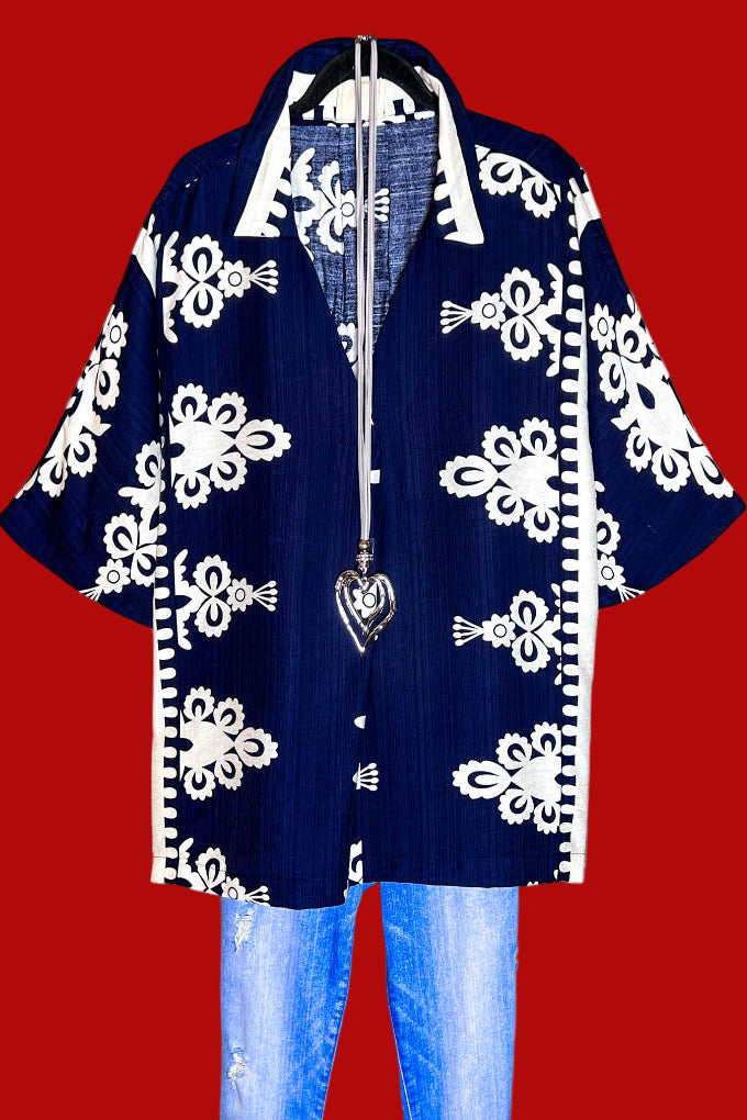 MAGIC OF CHOOSING JOY LACE & SUEDE SHIRT DRESS JACKET IN NAVY BLUE