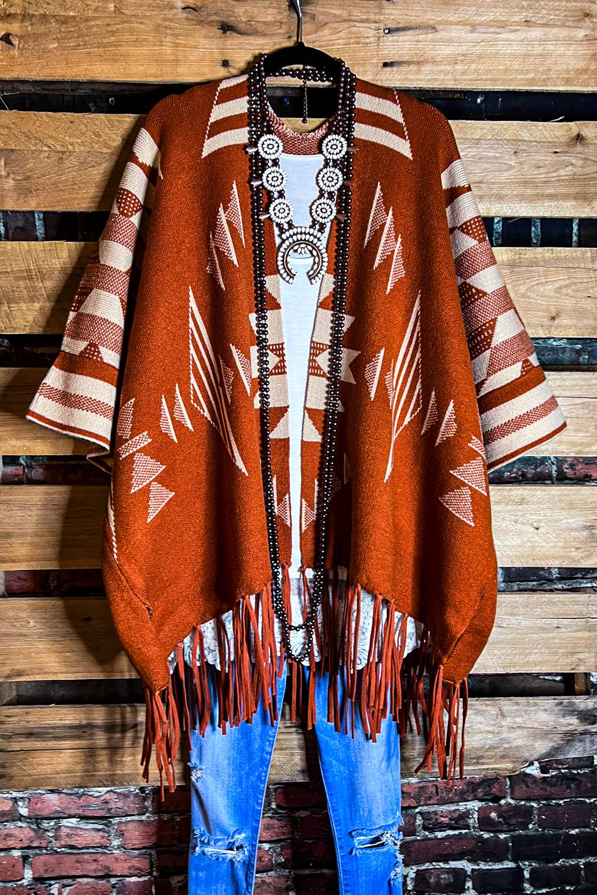 THE BRIGHTER SIDE BOHO RUANA CARDIGAN IN RUST