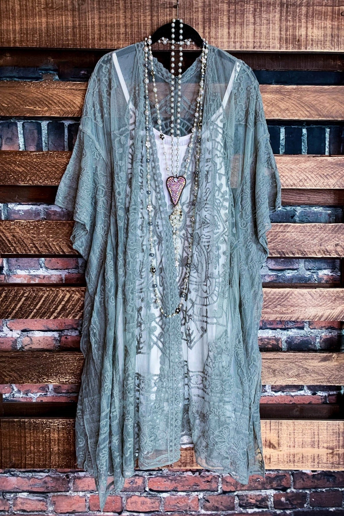 • Long Sheer lace cardigan kimono Duster with floral embroidery, tie front