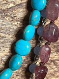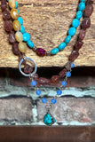 Leather strand adjustable length necklace with triple layer beaded chains. The chains feature crystal, turquoise an d mauve rock beads. The longer chain has a turquoise stone soldered chatm