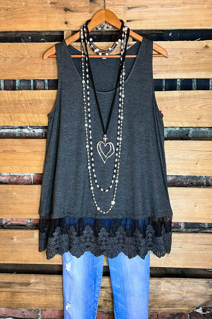 FULL OF GRACE CHARCOAL LACE SLIP DRESS EXTENDER TOP