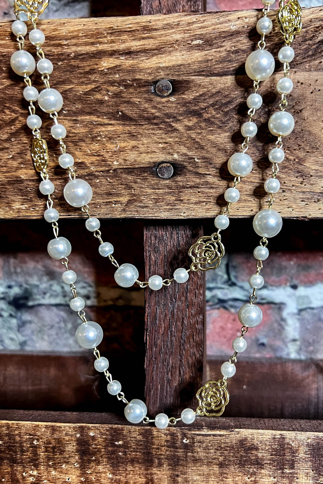TIMELESS CLASSIC BROWNISH-GOLD AND CREAM LONG PEARL BEAD NECKLACE
